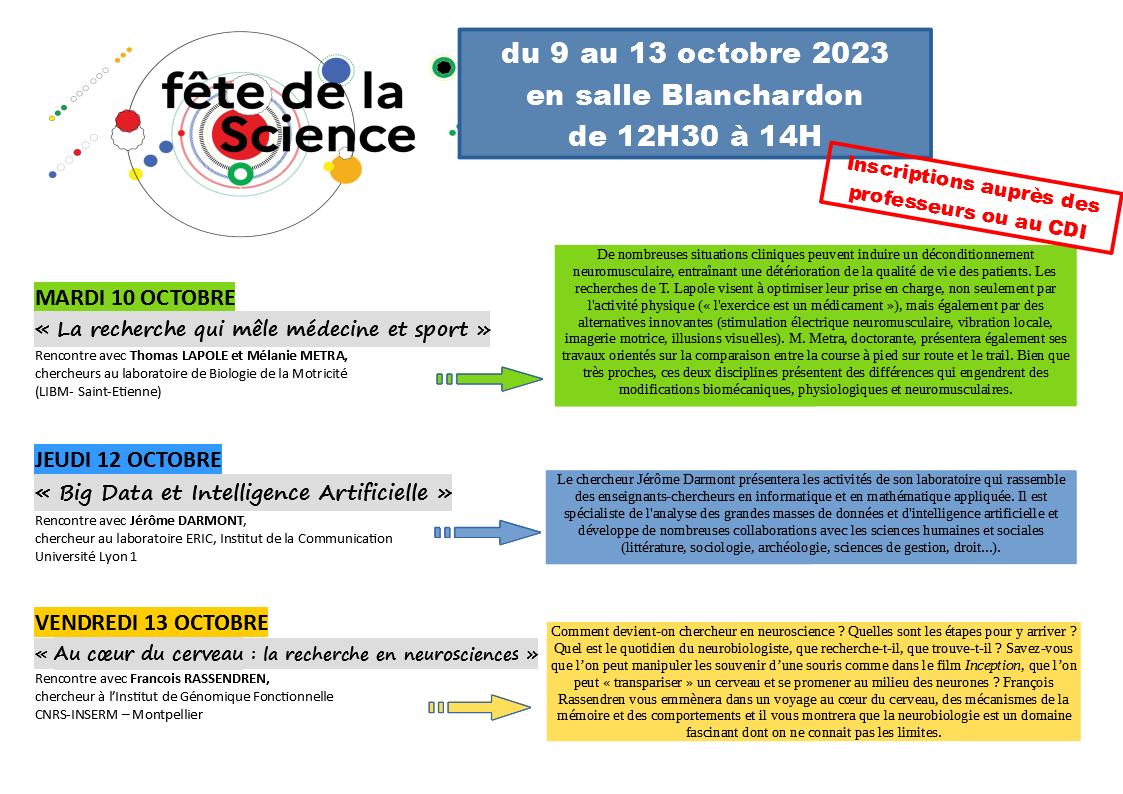 Mardi 10, Jeudi 12 et Vendredi 13 octobre, venez à la rencontre de chercheurs en biologie, neurosciences et en informatique !!!! RDV en salle Blanchardon de 12H30 à 14H